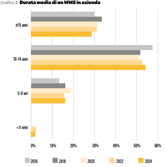 Il Grafico 3, tratto dal WMS Market Report 2024 del Fraunhofer IML, mostra che circa il 70% dei WMS viene utilizzato per un massimo di 14 anni.